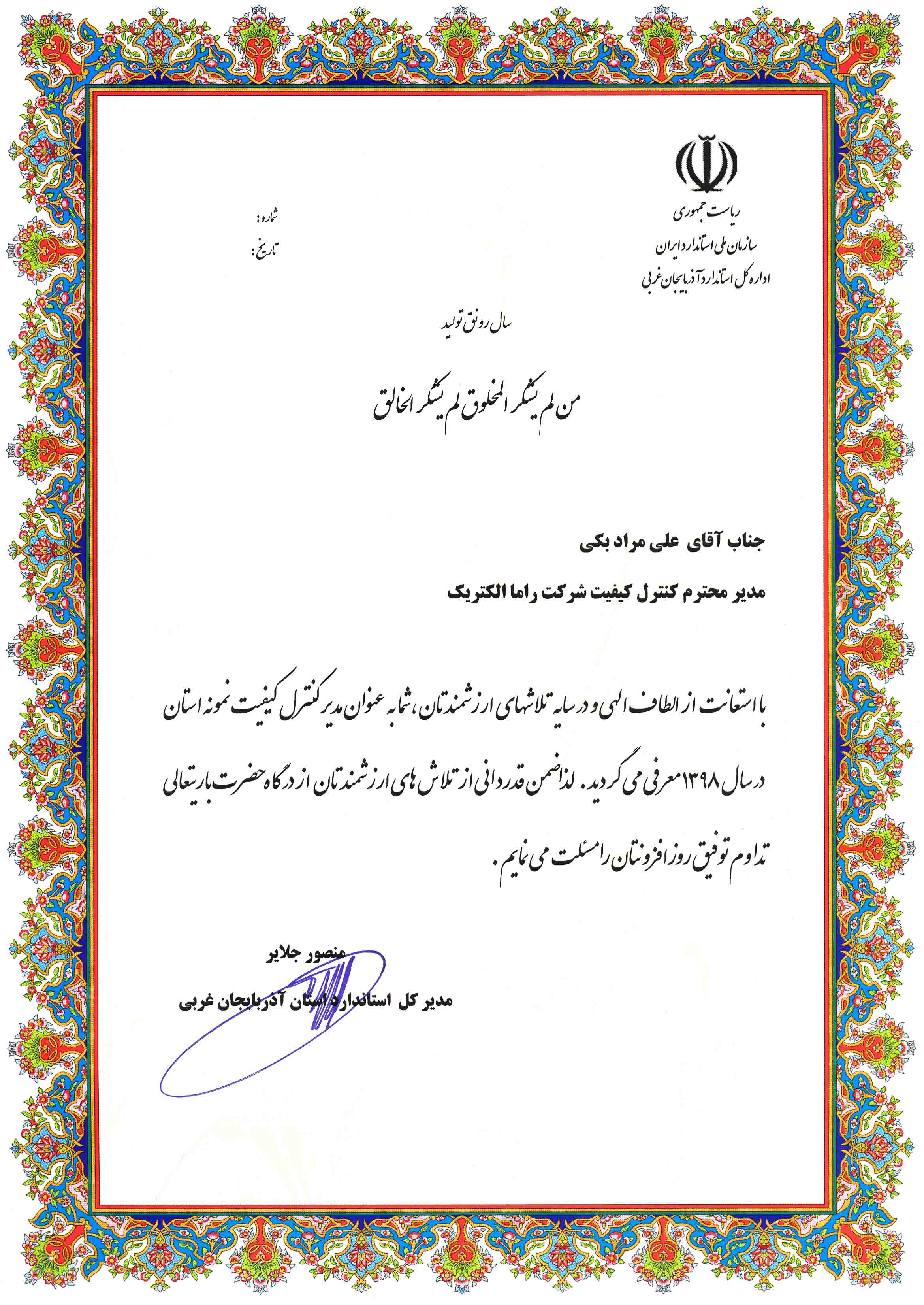 تقدیر از شرکت راما الکتریک به عنوان واحد برگزیده و مدیر کیفیت نمونه در سال 1398